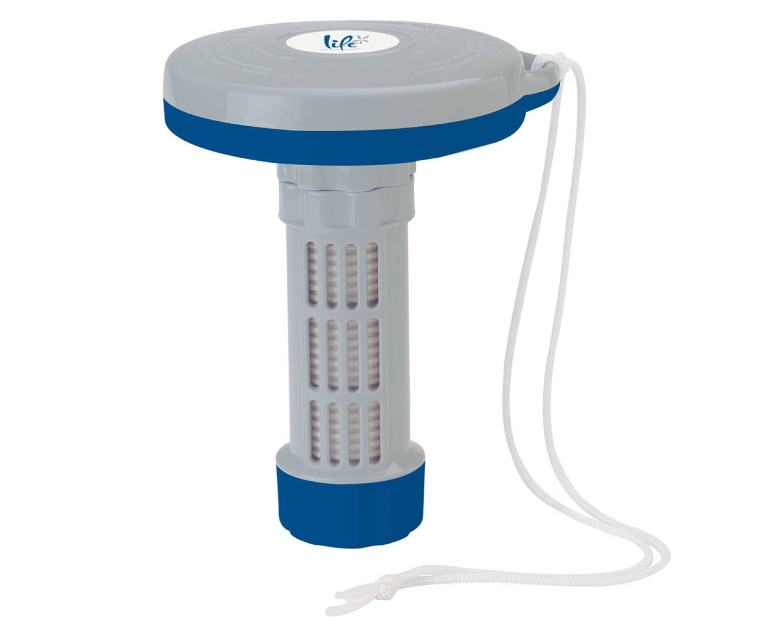Doseur flottant pour piscine et spa, avec bague de serrage pour régler la diffusion du brome ou chlore. Cordon et bouchon dévissable pour un changement rapide et facile des pastilles.